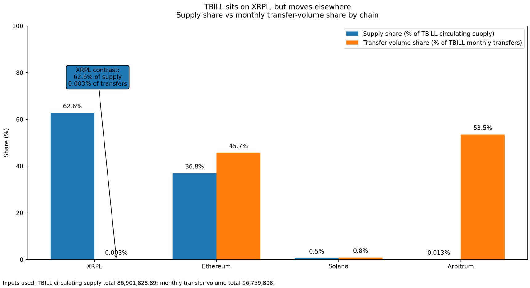 XRPL’s share of tokenized treasury value is most clearly reflected in TBILL: XRPL holds 54.41 million of the 86.90 million circulating tokens, representing about 62.6% of the TBILL supply.