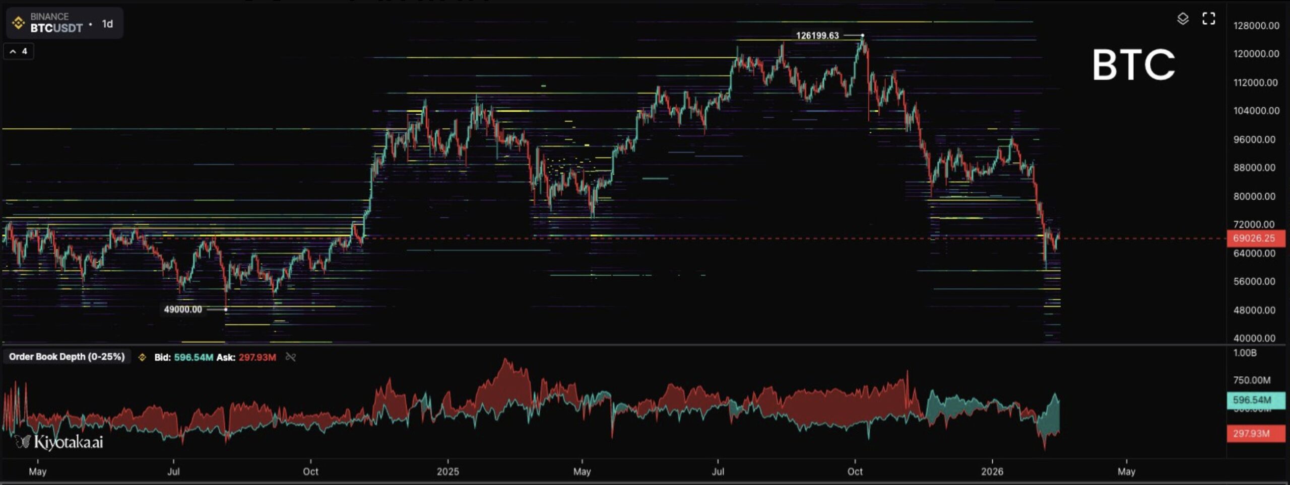 Meanwhile, the order book data shared by crypto trader Dom shows roughly $596 million in bids within 0–2.5% of price versus $297 million in asks. This near 2:1 bid-to-ask imbalance represents the largest bid skew in over two years.