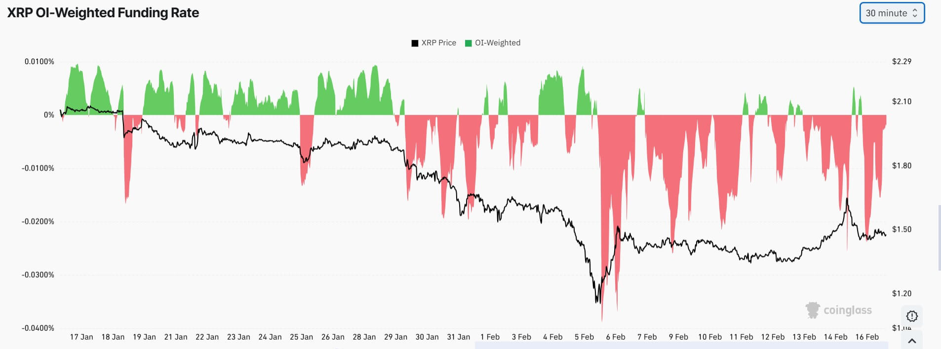 Data from CoinGlass indicate that XRP funding rates have turned negative over the past few weeks, with repeated spikes above -0.02%.