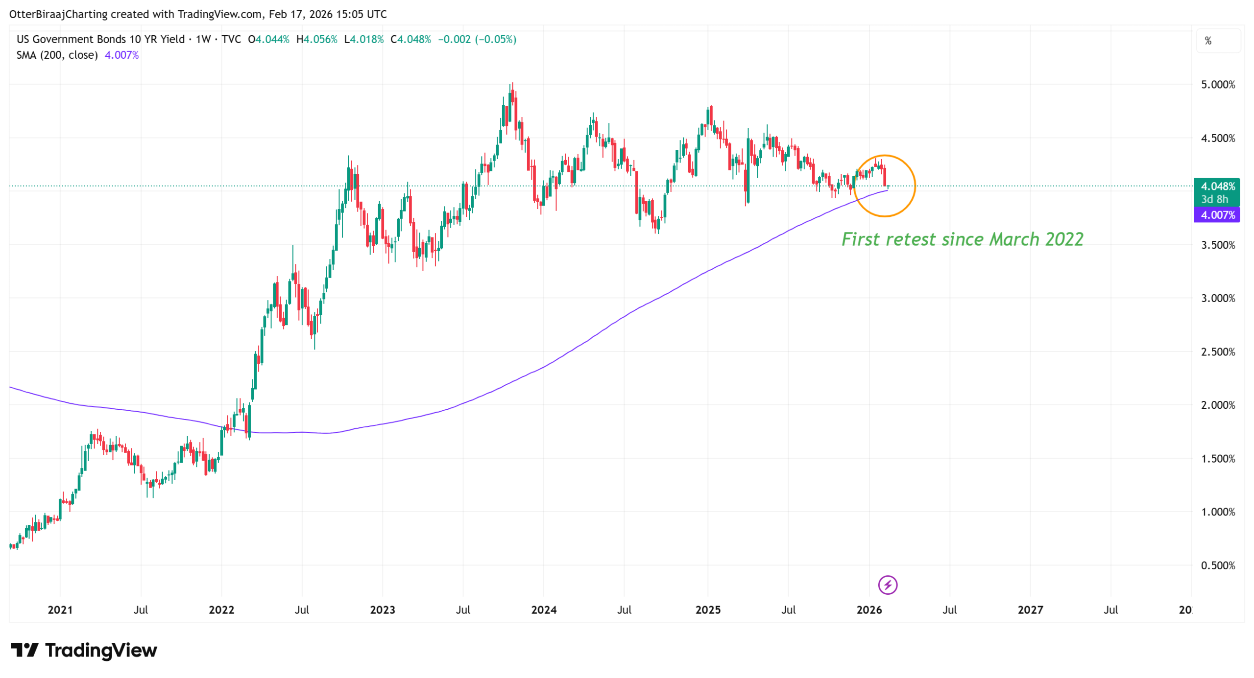 At the same time, the US 10-year Treasury yield fell 3.75% last week, its steepest weekly decline since September 2025. Now at 4.02%, the yield is set to retest its 200-period simple moving average (SMA) for the first time since March 2022.