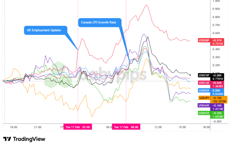The U.S. dollar traded in an intraday range on Tuesday, ultimately closing mixed against major currencies with an arguably net bearish lean overall. The session featured two distinct macro catalysts — the U.K. labor market report in the London session and the Canada CPI in the U.S. session — each of which drove notable but ultimately transient moves for the dollar’s key counterparts.