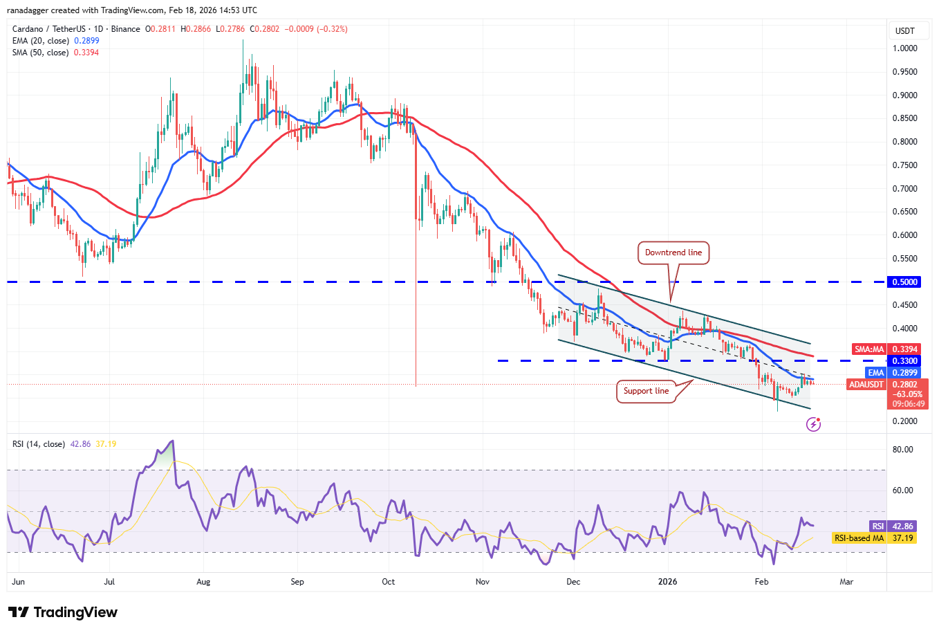The possibility of a break above the 20-day EMA remains high. If that happens, the ADA/USDT pair may climb toward the downtrend line, which is expected to act as a stiff resistance. If buyers pierce the downtrend line, the Cardano price may rally to $0.44 and then to $0.50.