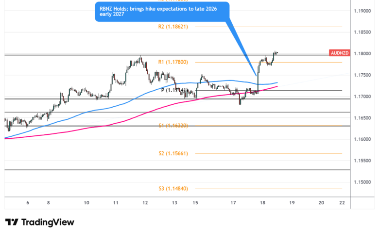 The RBNZ held the OCR at 2.25% — expected — but the tone was the market mover. Governor Breman’s updated forecast track pushed the first potential hike to late 2026/early 2027, well short of the near-two-hikes-by-year-end that markets had priced in. The Kiwi sold off sharply across the board. For AUD/NZD, the setup is constructive: the RBA has unanimously hiked 25bps and flagged more to come, creating a clear monetary policy divergence. AUD/NZD spiked through R1 (1.17800) and is now testing 1.1800+. This case study frames two realistic post-event scenarios with actionable trade management principles.