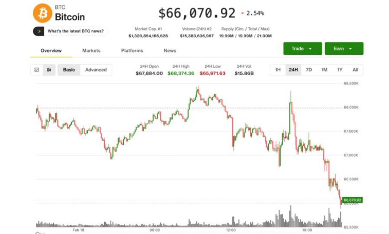 Having traded $68,500 overnight, BTC was down 2.5% over the past 24 hours and last trading at $66,200.