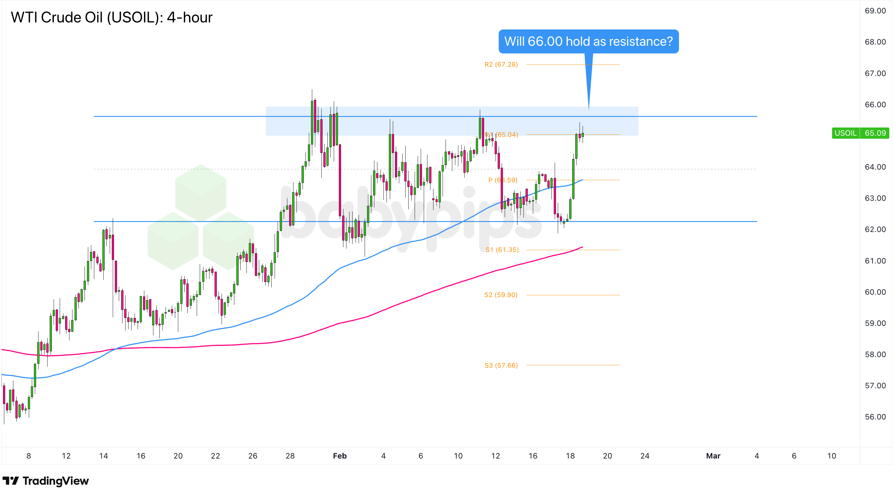 USOIL has been stuck in a 400-pip range between $62.00 and $66.00 since late January and is now knocking on the $65.00 psychological level, which lines up with the R1 Pivot Point at 65.04.