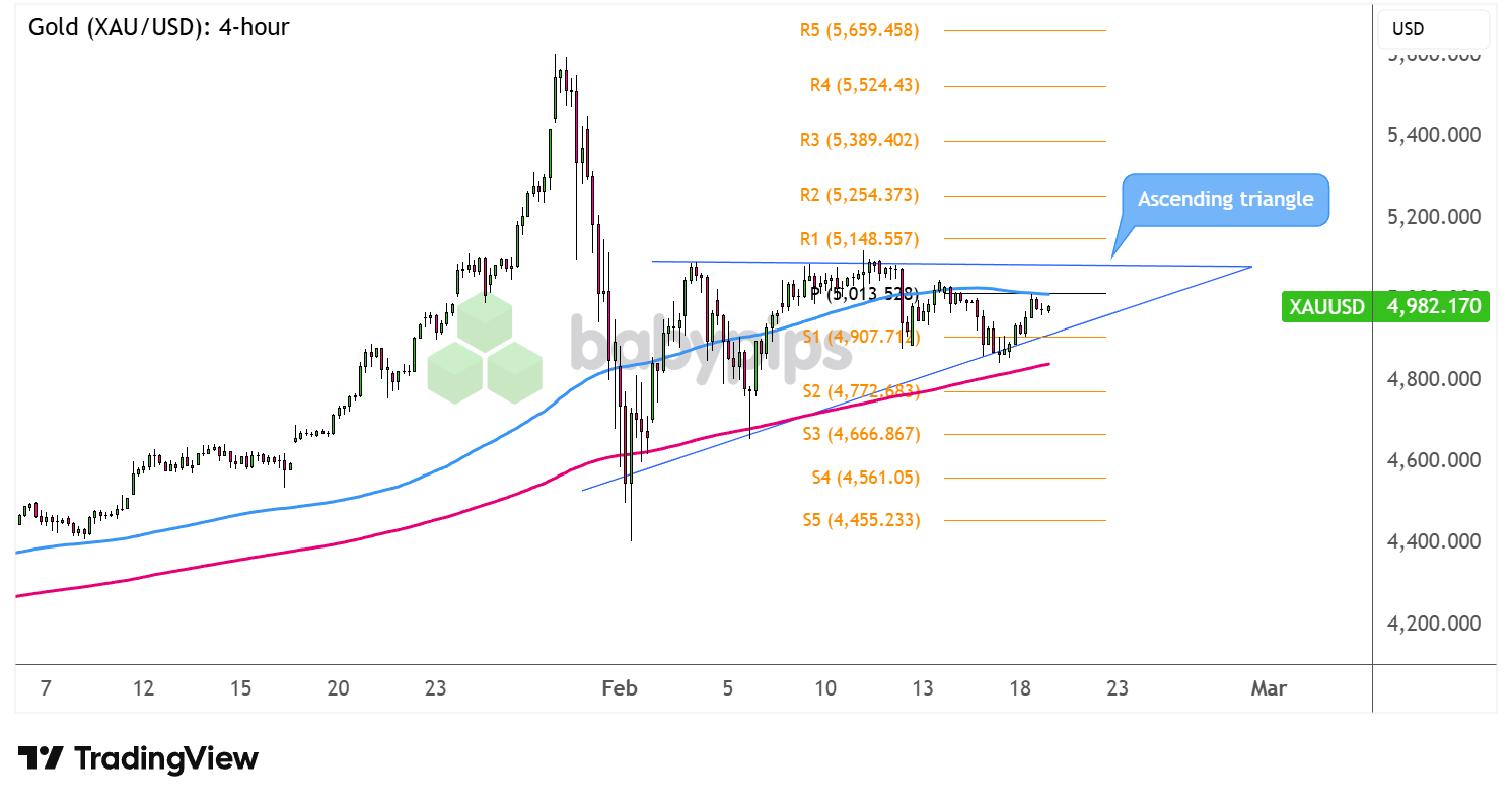 XAU/USD just bounced off the triangle support at S1 ($4,907.71) and appears to be setting its sights on resistance around the $5,100 major psychological level.