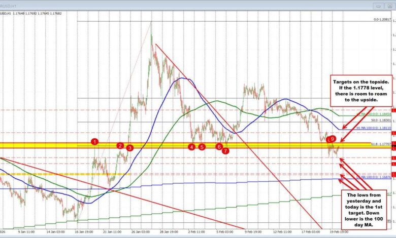 From a technical perspective, the hourly chart shows that sellers were able to push the price below a key swing area between 1.1765 and 1.1778 yesterday — extending the downside move that began on Wednesday when the pair rotated lower from the 1.1860 area and moved away from its 100- and 200-hour moving averages. The decline reached a low of 1.1741 before buyers stepped in, prompting a corrective rebound that stalled at 1.17775 early in the Asian session.