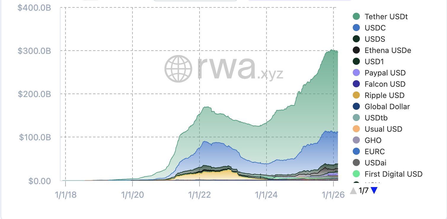The total market capitalization of stablecoins is over $295 billion at the time of this writing, according to RWA.XYZ, down from the peak of over $300 billion recorded in December.