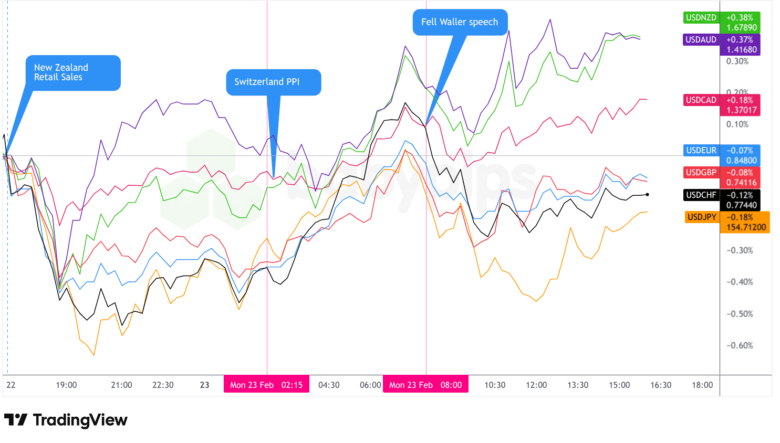 The mixed currency performance suggested that Monday’s dominant theme was uncertainty rather than a clear directional trade policy narrative, with traders likely awaiting clarity on whether Trump’s Section 122 tariffs will face legal challenges or whether trading partners will honor existing agreements under the new framework.