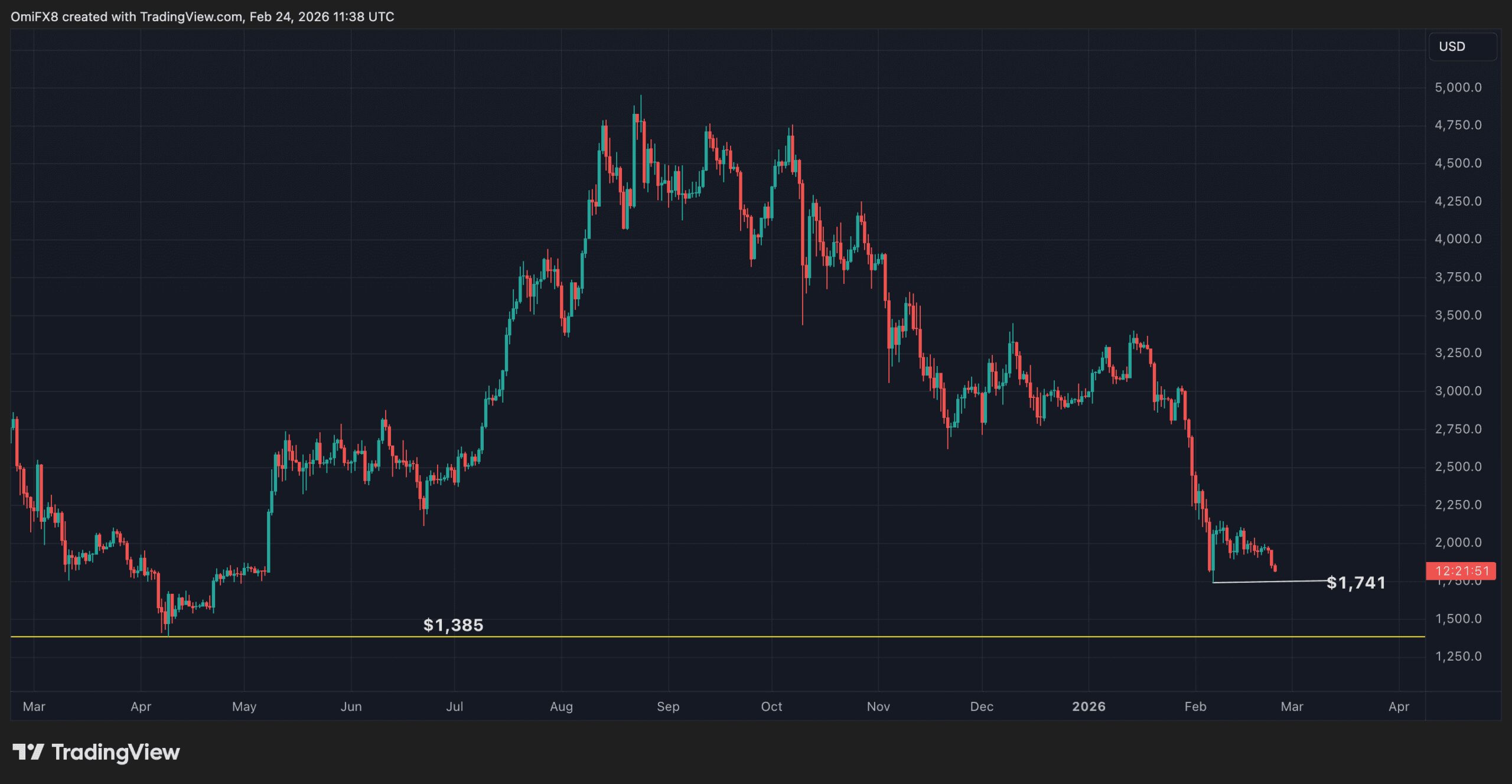 Ether is under pressure, sliding toward key support levels. (TradingView)