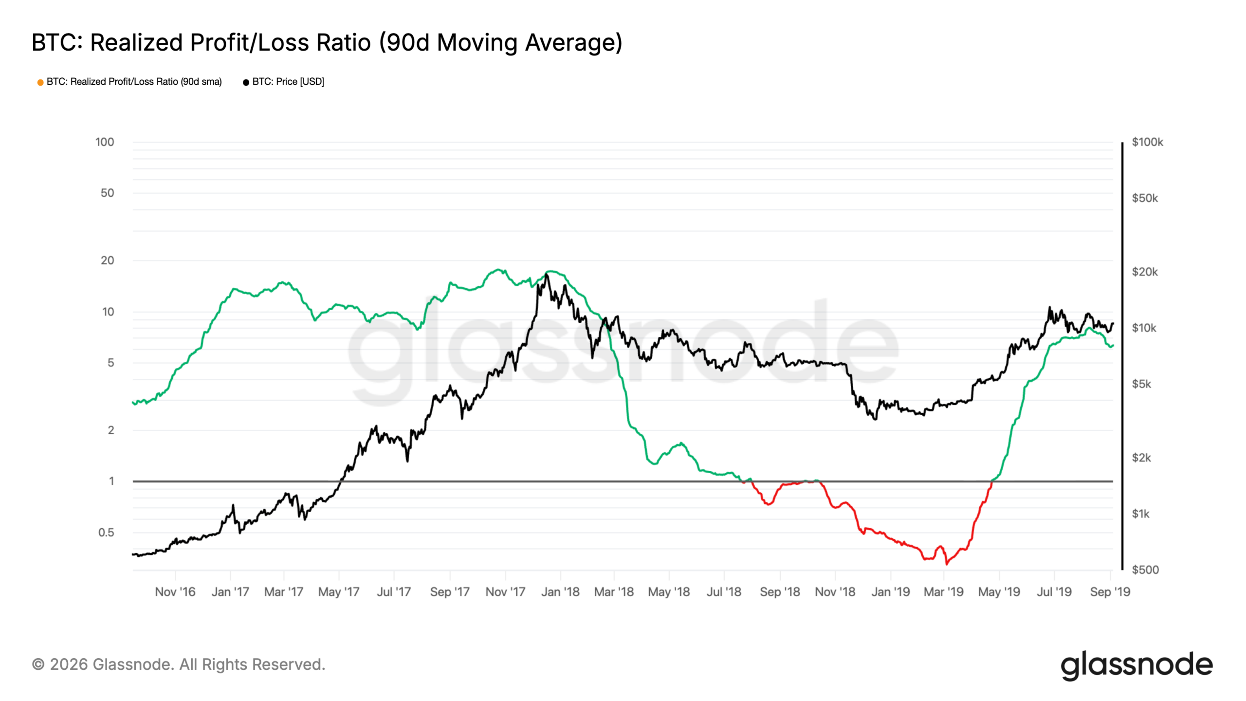 BTC realized profit/loss ratio (90-day moving average). Source: Glassnode