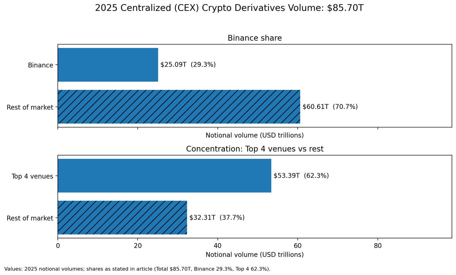Binance captured $25.09 trillion or 29.3% of the $85.70 trillion centralized crypto derivatives market in 2025, while the top four venues controlled 62.3% of total volume.