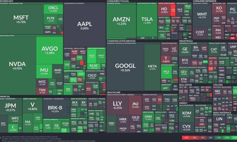 The stock market displayed a vibrant scene today, with a notable rally in the technology and consumer cyclical sectors. The heatmap shows particularly strong performance in semiconductor stocks and consumer retail giants, contributing to today’s positive market trajectory.
