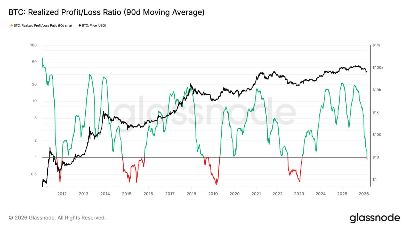 The 47% drawdown from all-time highs is at historically mid-to-late bear-market depth. Approximately 9.2 million BTC held at a loss creates selling pressure on rallies as holders rotate out of underwater positions.