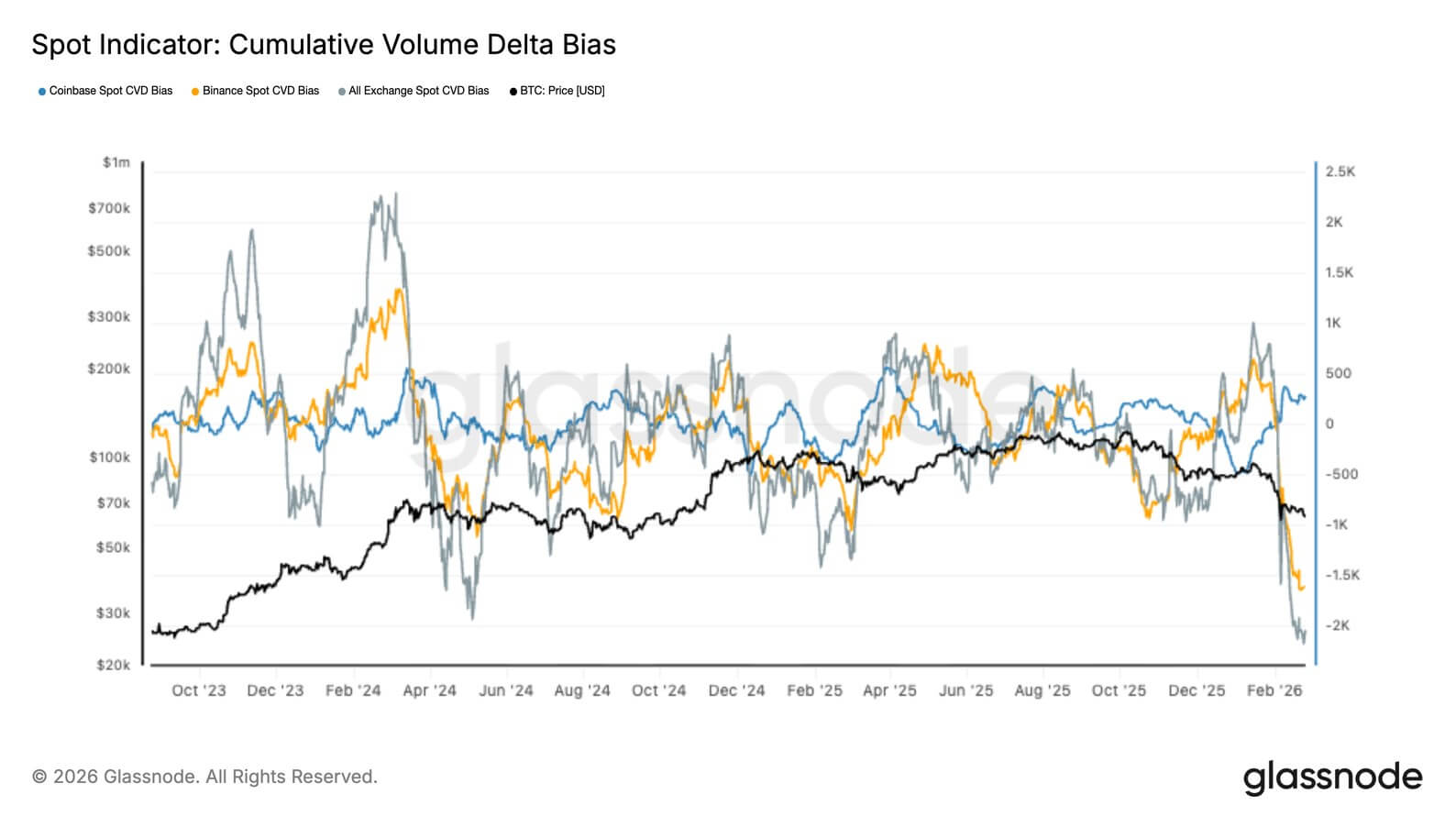 The second is spot markets flipping from sell-dominant to bid absorption, with Glassnode’s spot Cumulative Volume Delta stabilizing and trending positive.