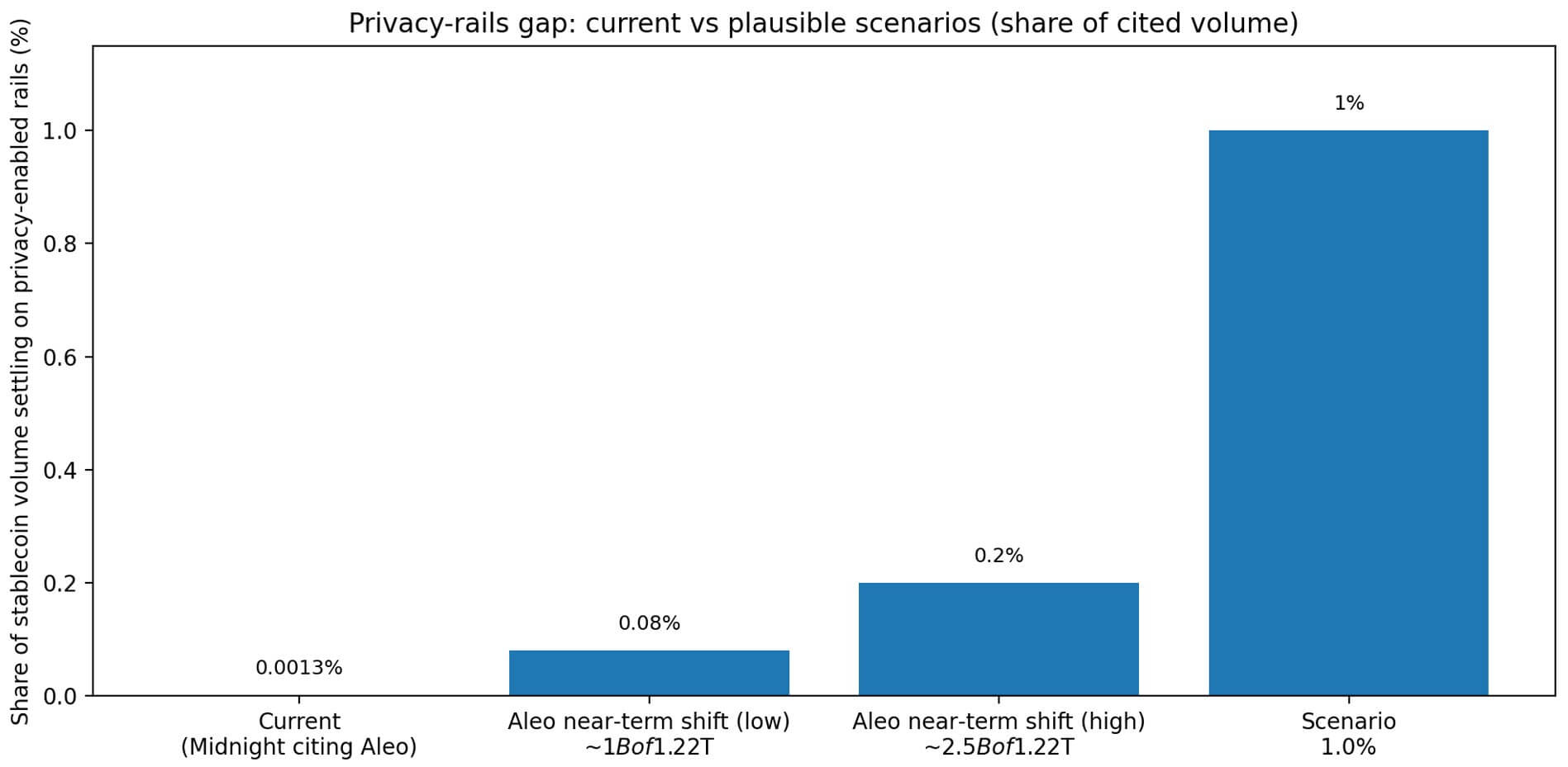 Midnight cites research from Aleo’s 2025 Privacy Gap Report, which claims $1.22 trillion in institutional stablecoin transaction volume, with only 0.0013% settling on privacy-enabled rails.