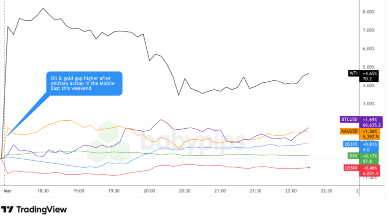 By now, everyone knows what’s happening as the US and Israel strike Iran. Here is the state of play one hour into futures trading: