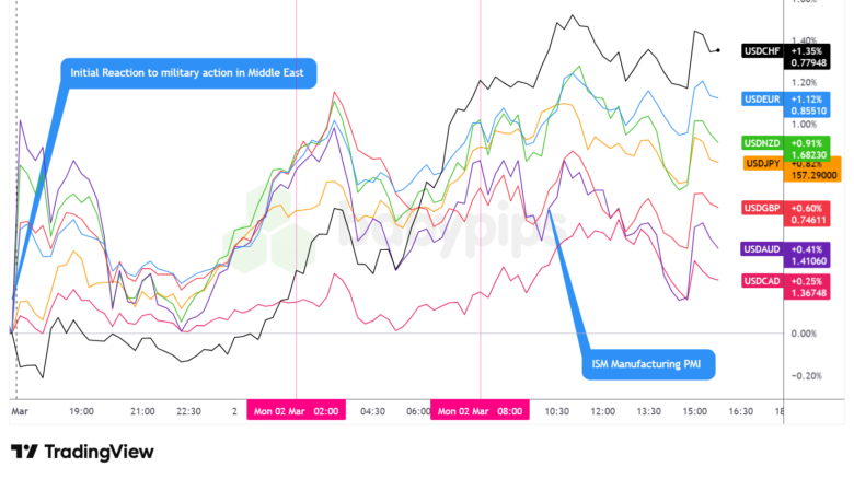 The U.S. dollar emerged as Monday’s strongest performing major currency, posting broad-based gains as geopolitical tensions intersected with hawkish repricing of Federal Reserve rate expectations following the ISM Manufacturing data release.