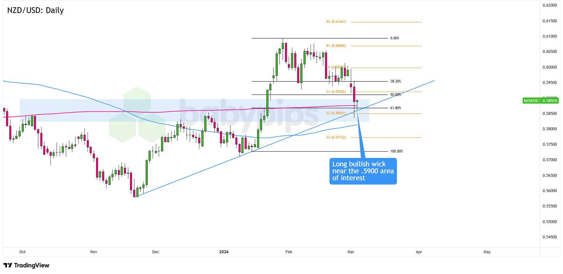 NZD/USD, which has been making higher highs and higher lows since late 2025, has pulled back from its .6000 consolidation and is now trading closer to the .5900 area.