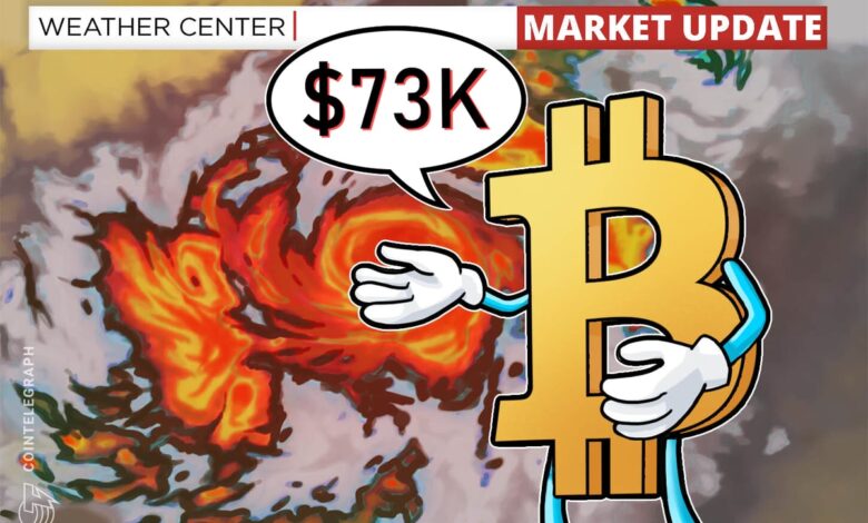 Bitcoin hit monthly highs of $73,019 at the day’s Wall Street open, continuing a rebound that accompanied renewed conflict in the Middle East.