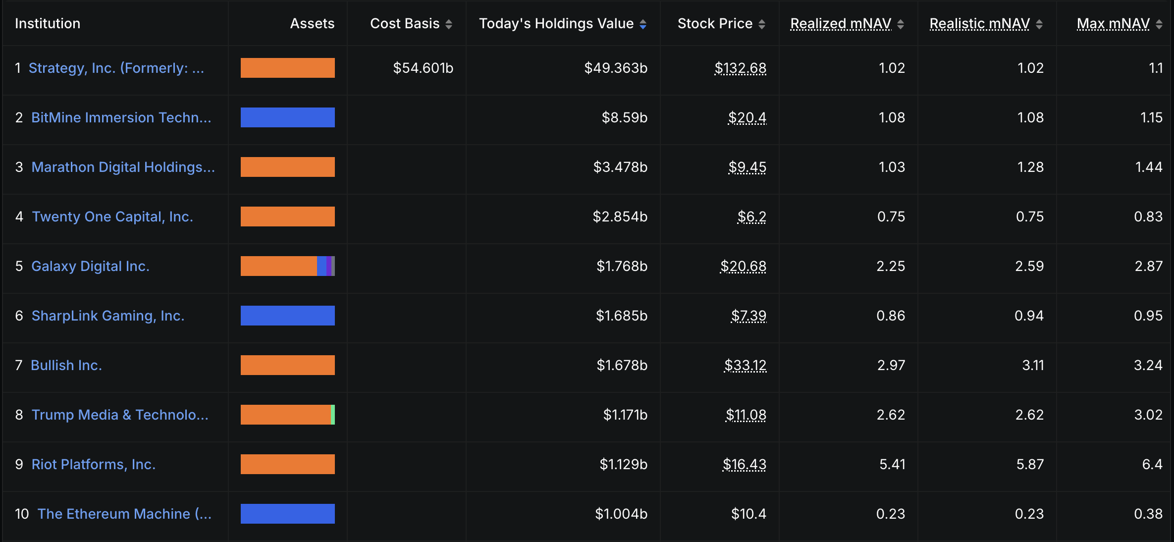 The 10 biggest crypto treasury companies, ranked by their crypto holdings. Source: DeFiLlama