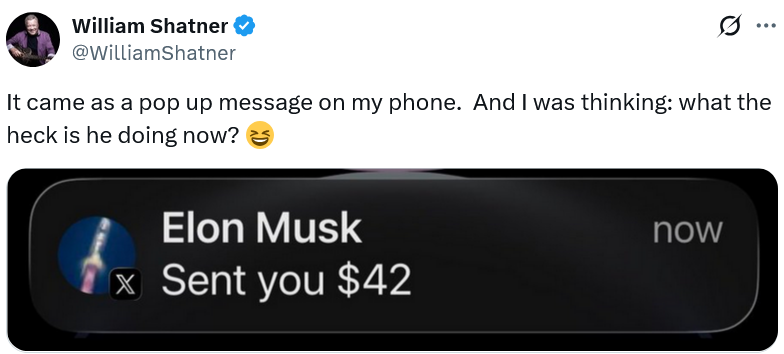 Shatner has since used the $42 sent to him by Musk to raise money for charity. With the permission of X, Shatner auctioned out 42 X Money beta invites for $1,000 each.