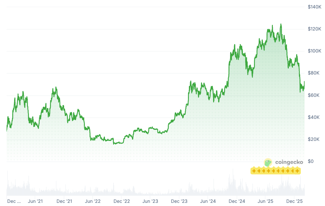 The argument that Bitcoin acts as an inflation hedge has weakened recently as the cryptocurrency’s price declined sharply. Bitcoin has fallen about 50% from its October 2025 peak of above $126,000, returning to late-2024 levels and briefly touching lows near $60,000.