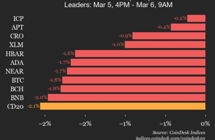 CoinDesk Indices presents its daily market update, highlighting the performance of leaders and laggards in the CoinDesk 20 Index.
