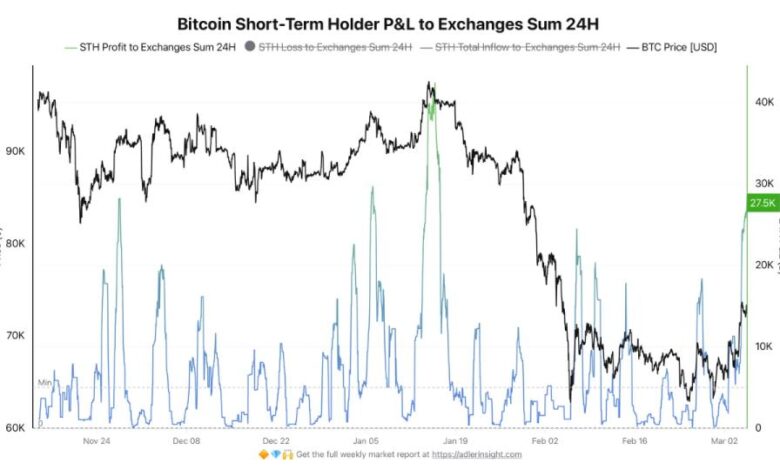CryptoQuant analyst Darkfost explains that short-term holders transferred more than 27,000 BTC ($1.8 billion) to exchanges in profit over the past 24 hours — one of the largest spikes in recent months.
