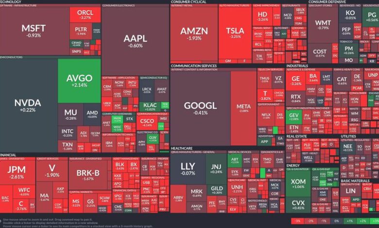 The US stock market is experiencing a volatile session today, marked by significant sectoral shifts and investor uncertainty. The day’s trading has highlighted the tumult in the tech and financial sectors, while energy stocks display unexpected gains.