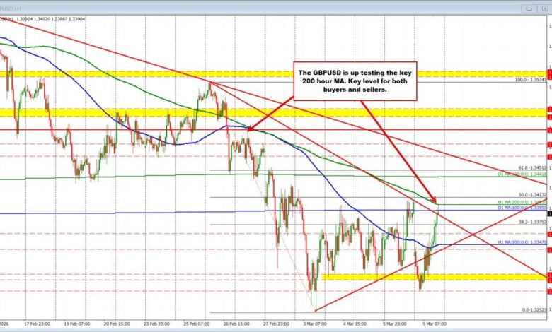 Looking ahead, the pair is now approaching a key resistance zone defined by the 100-day moving average at 1.3395 and the falling 200-hour moving average at 1.3403. This area has proven important before. On February 27, the rally stalled near a similar convergence of moving averages before the pair turned sharply lower over the following two sessions, eventually bottoming at 1.32523.