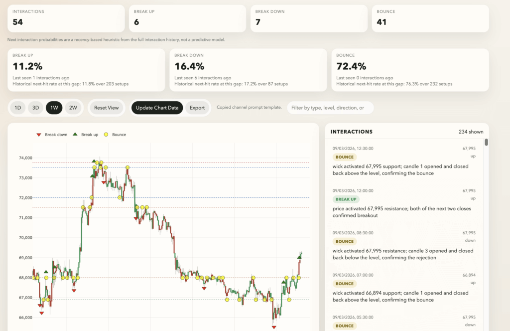 Over the weekend, I built a tool around that framework. Instead of relying solely on chart screenshots, it tracks how Bitcoin interacts with those channels in real time, flagging key bounces and breaks, making the analysis faster, cleaner, and easier to review.