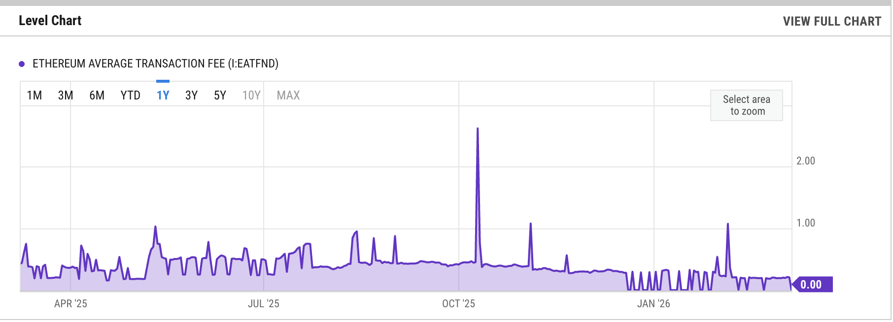 That condition has weakened. Ethereum’s average transaction fee is about $0.21 in March, down roughly 54% from a year earlier, according to YCharts.