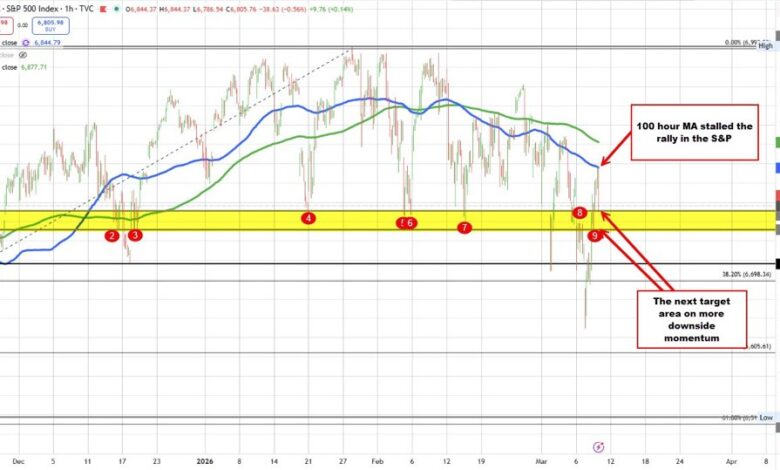 The S&P moved from 6831 to a low of 6786. The S&P is now trading at 6796 which is near unchanged on the day. The high price reached over the last hour peaked at 6845.08. The 100 hour MA comes in at 6844.76. Peaking near that level keeps the sellers in play technically. Support being approached at 6764 to 6789 now (see yellow area on the chart below).