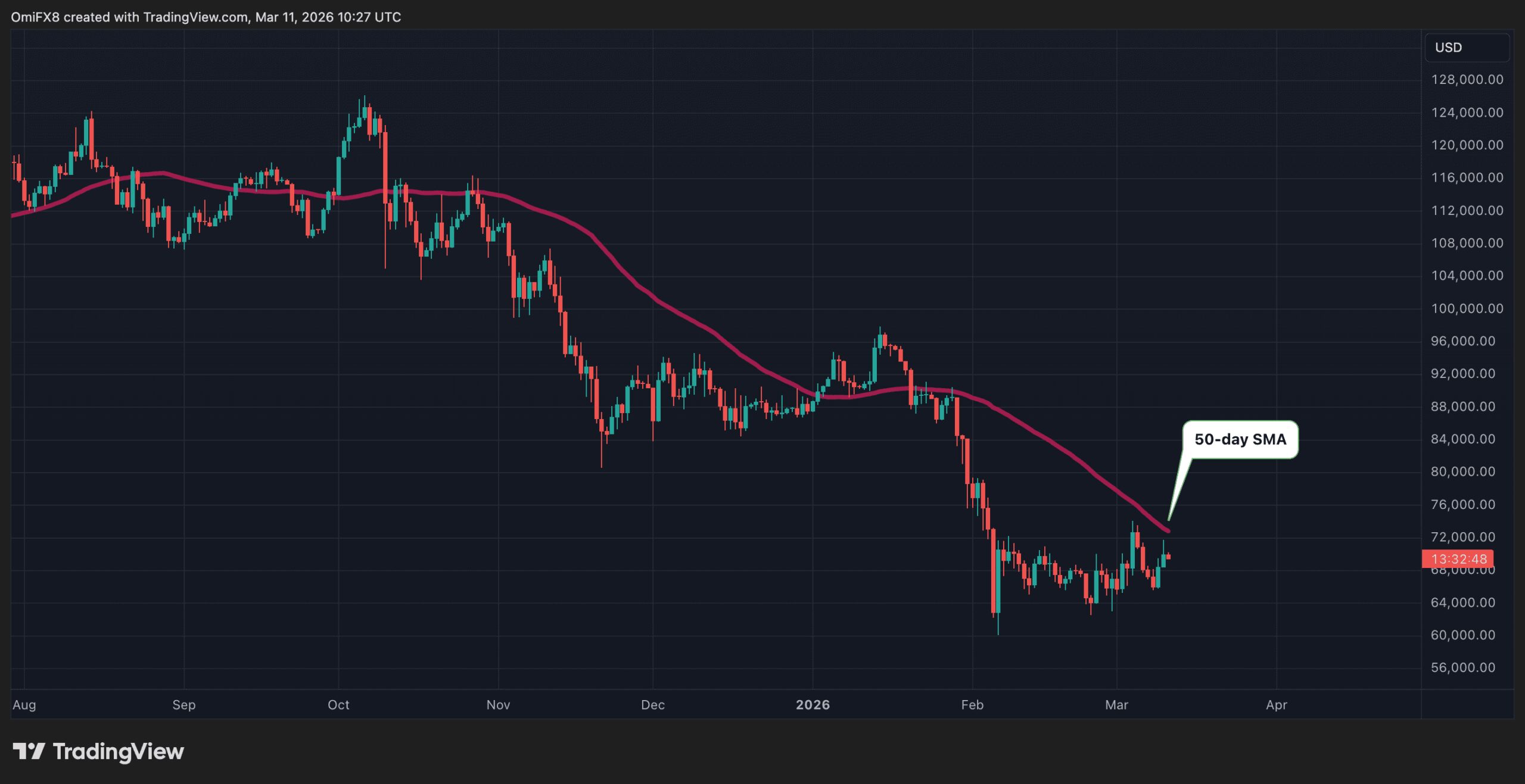 - The chart shows bitcoin’s daily price swings in candlestick format since July last year. It also shows the average price over 50 days.