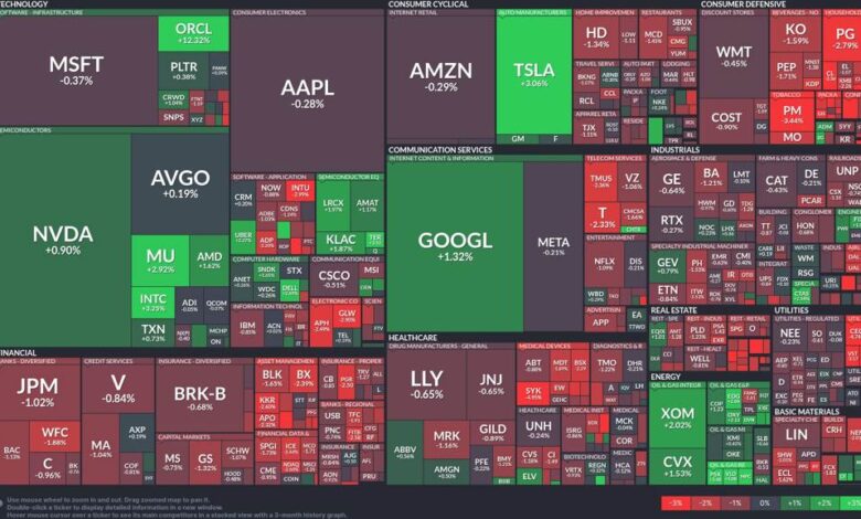 Today’s market heatmap reveals a mixed performance landscape, with the technology sector standing out amid broader market challenges. Semiconductors are demonstrating notable strength, while utilities and financials endure weaknesses.