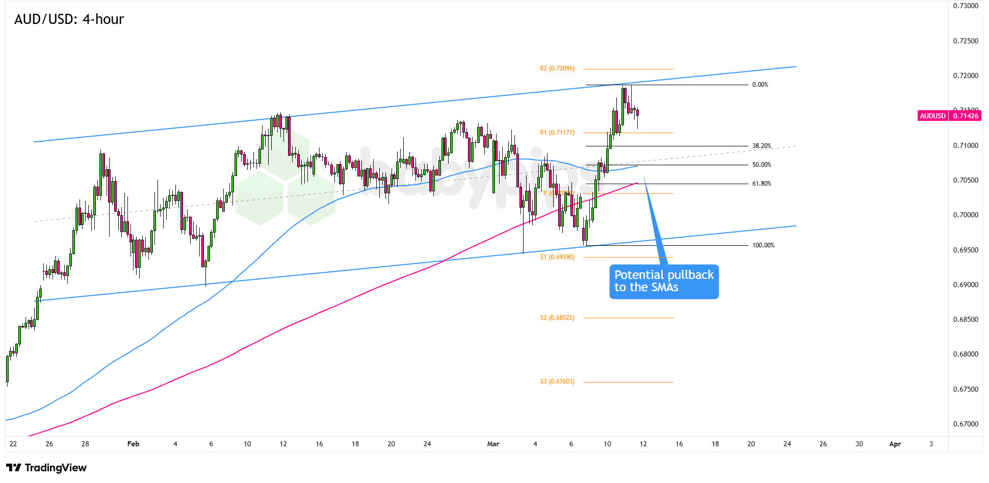 So far, bearish pressure has only pulled the pair back to around the .7145 area. But if risk sentiment sours, AUD/USD could slide toward stronger support near .7050, where the channel midpoint, the 50% Fibonacci retracement, and the 100 and 200 SMAs all line up.