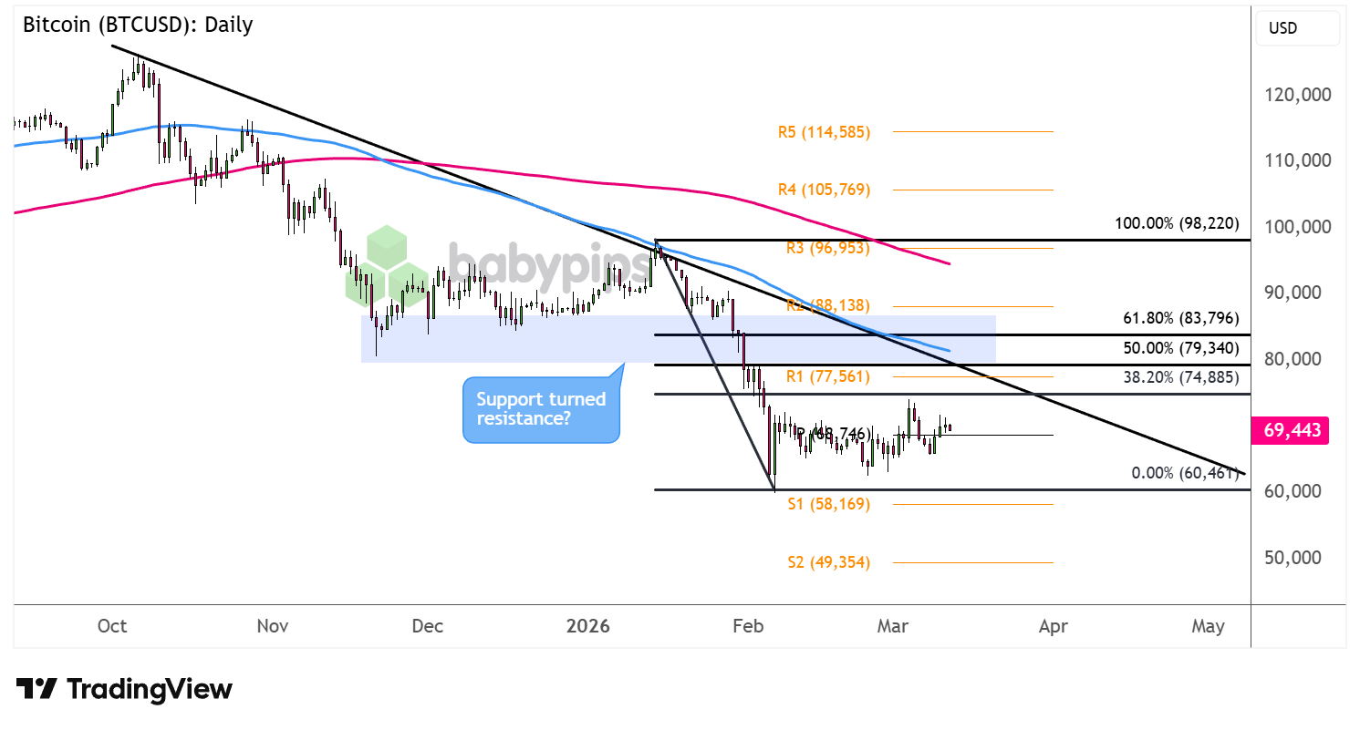 BTC/USD is closing in on the 38.2% Fibonacci level ($74,885) and could still go for a higher pullback to the 50% Fib closer to R1 ($77,561) or the 61.8% retracement near the longer-term falling trend line.
