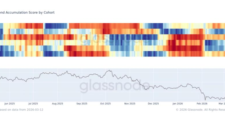 Glassnode’s Accumulation Trend Score, which measures whether different wallet groups are buying or selling, has dropped to around 0.04, signalling deep net distribution across the network.