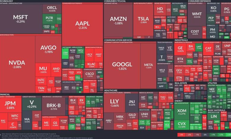 - 📉 Technology: Major tech stocks are under pressure. Semiconductor giants like Nvidia (NVDA) and AMD (AMD) have dropped by 2.08% and 3.22%, respectively. Apple (AAPL) also faces a decline by 2.31%, reflecting investor concerns in consumer electronics.
