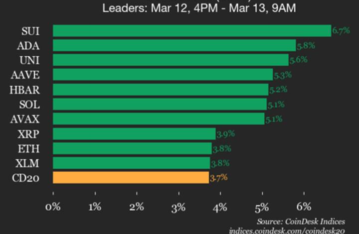 Leaders: SUI (+6.7%) and ADA (+5.8%).