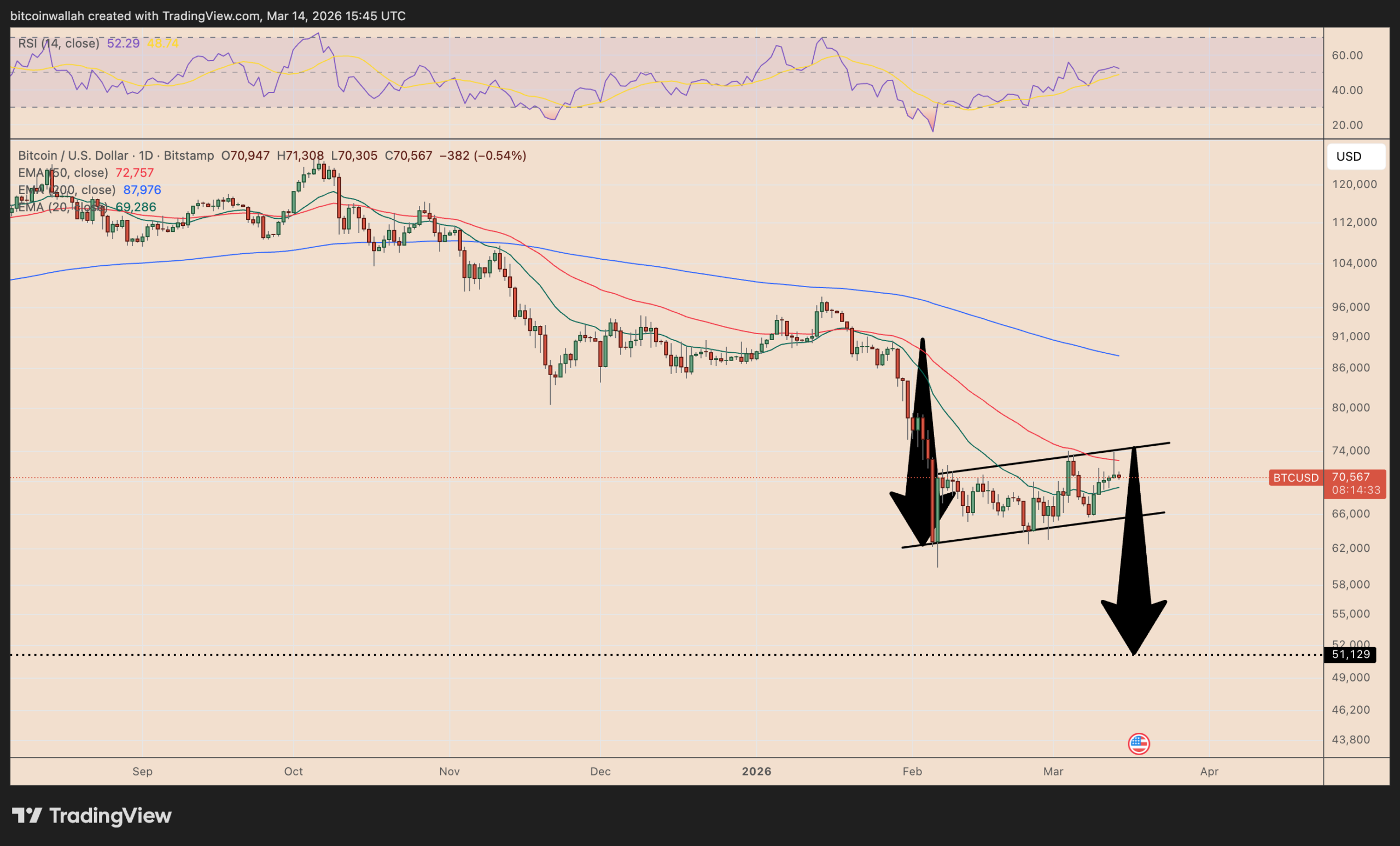 Applying the bear flag principle to Bitcoin’s chart places the measured downside target at around $51,000.