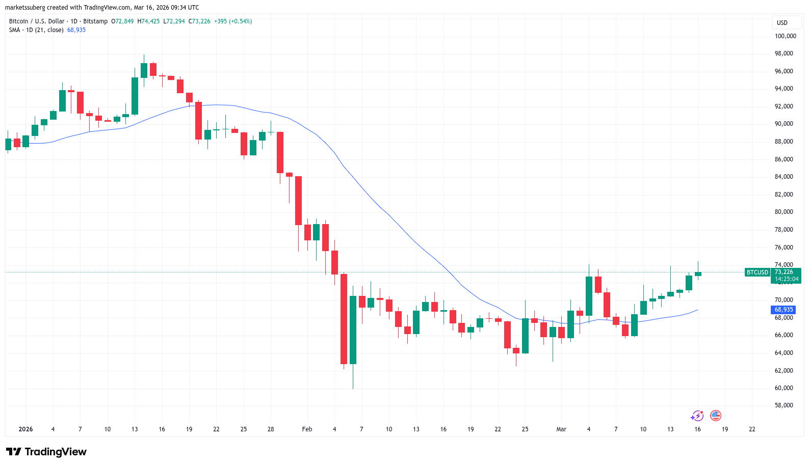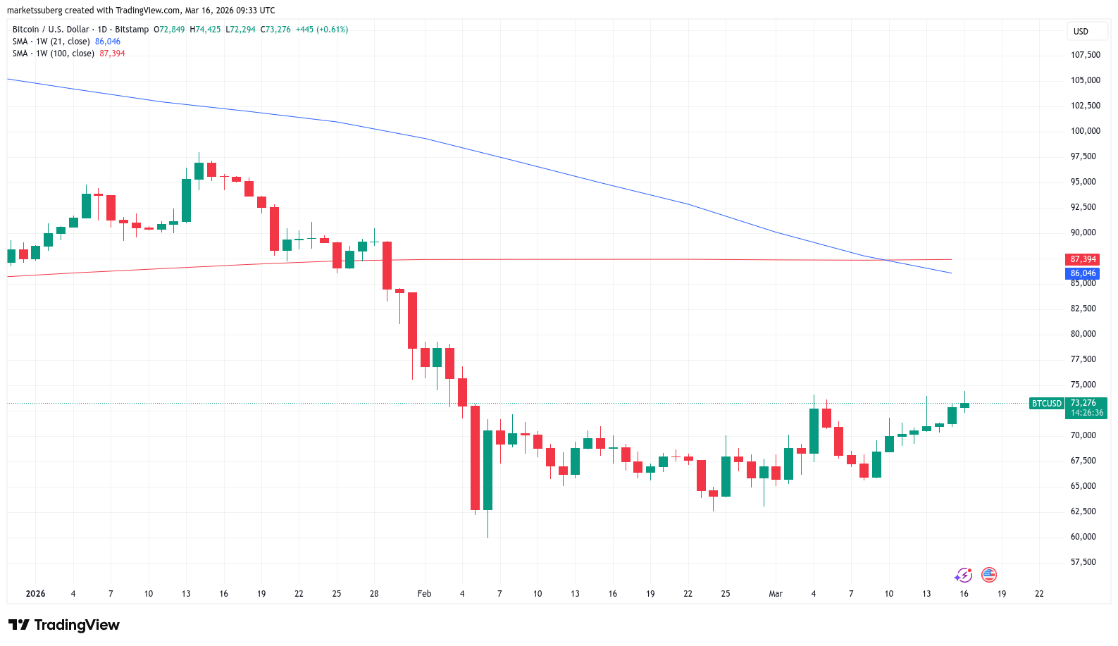 Bitcoin (BTC) starts the third week of March fighting for a breakout after a trip to near $75,000.