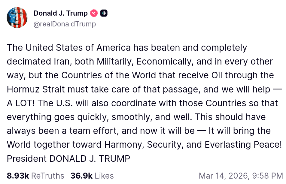 In a post on Truth Social, Trump wrote that “the Countries of the World that receive Oil through the Hormuz Strait must take care of that passage, and we will help — A LOT!”
