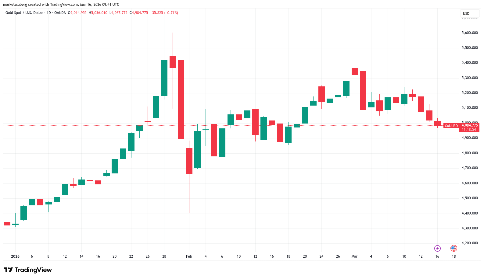 XAU/USD dipped below the $5,000 mark to start the week, hitting its lowest levels since mid-February. Against Bitcoin, gold dropped to levels not seen since Feb. 5.