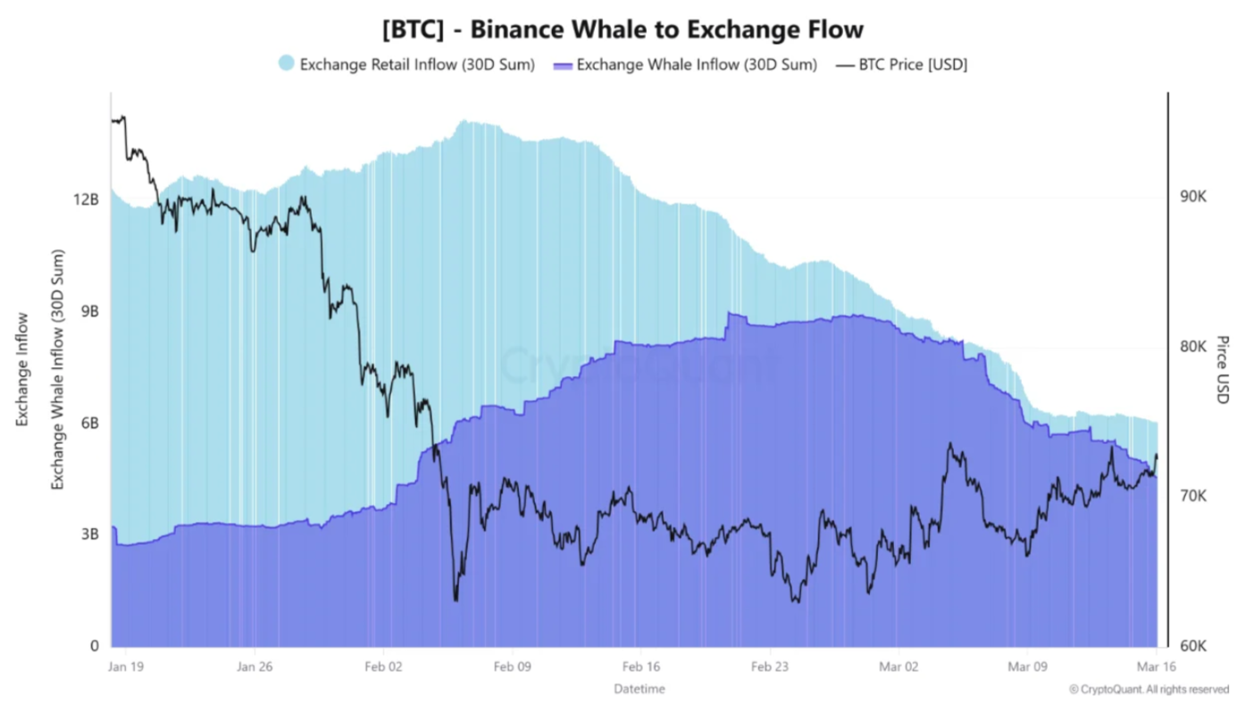Taha noted that flows from both retail and whale wallets to Binance have “dropped significantly” on rolling 30-day time frames. Whale inflows, for example, fell from $8.8 billion to $4.5 billion in the first two weeks of March.
