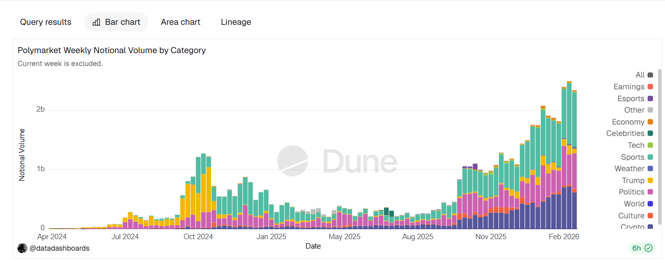 Polymarket notional trading volume, weekly, all-time chart. Source: Token Terminal