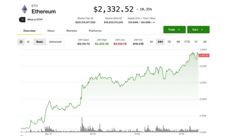 Ethereum’s ether (ETH) is stealing the spotlight in Monday’s crypto rally, climbing to a six-week high as investor demand show signs of return to the second-largest digital asset after months of bruising declines.