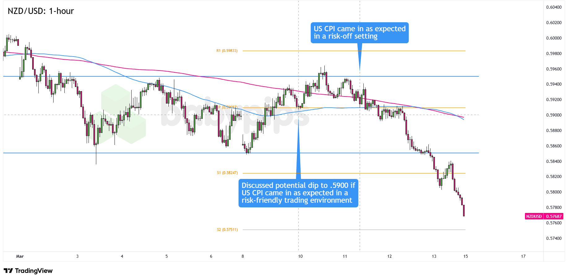 Our analysts had looked for an in line CPI print paired with calmer geopolitical headlines to attract buyers near the 0.5900 Pivot Point (0.5909). From there, NZD/USD could have pushed back toward the 0.5950 resistance area and possibly the R1 (0.5983) level.