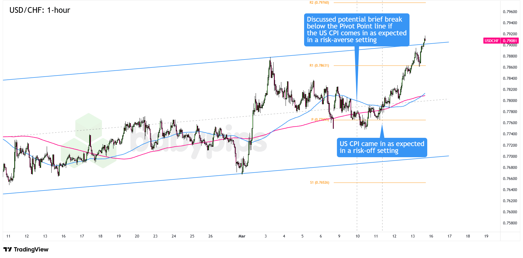 The original watchlist, guided by the Event Guide’s view that an in-line or slightly soft CPI would have limited impact on the dollar, flagged USD/CHF as a potential dip buying opportunity. With the pair trending higher inside an ascending channel, analysts were watching for a pullback toward the mid-channel zone near the Pivot Point (0.7766) as an area where bulls might step back in and continue the broader uptrend.